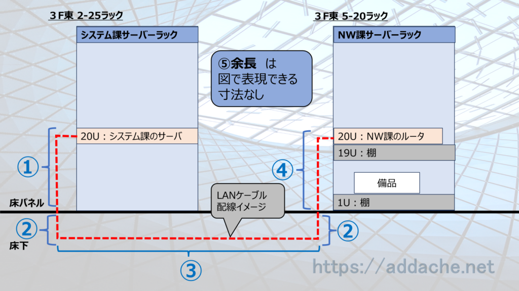 ③接続元ラック~接続先ラックまで床下配線する距離