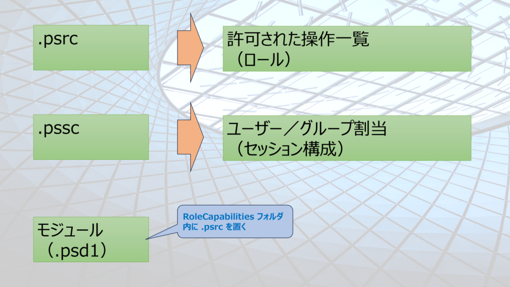 | RoleCapability (.psrc) | 実行可能な Cmdlet/外部コマンドなどを定義するファイル。 |